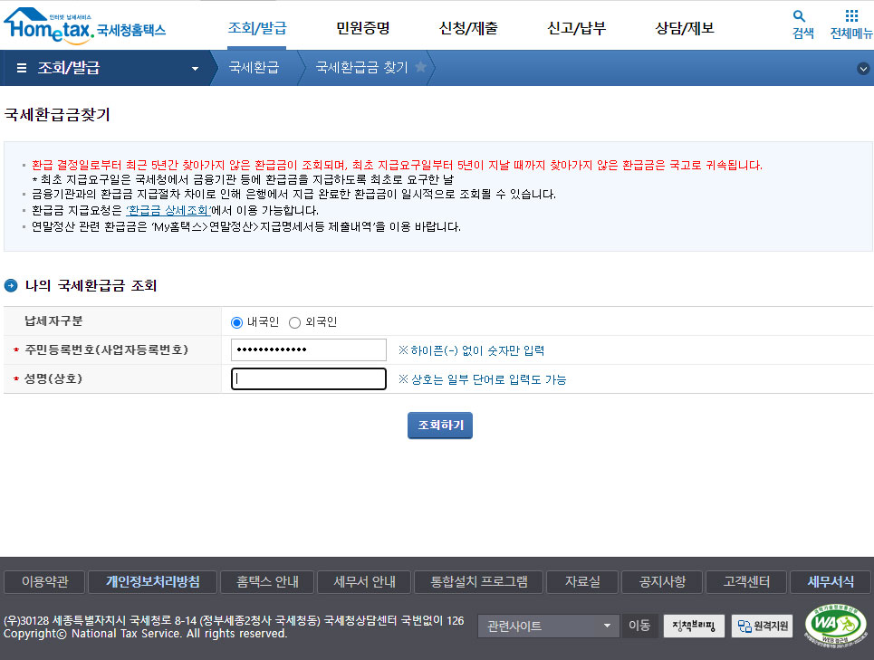 나의 국세환급금 조회 페이지에서 주민등록번호 또는 사업자등록번호를 하이픈(-) 없이 작성하시고 성명 또는 상호를 넣으신다음 조회하기를 클릭하시면 받을 수 있는 국세환급금이 조회됩니다.