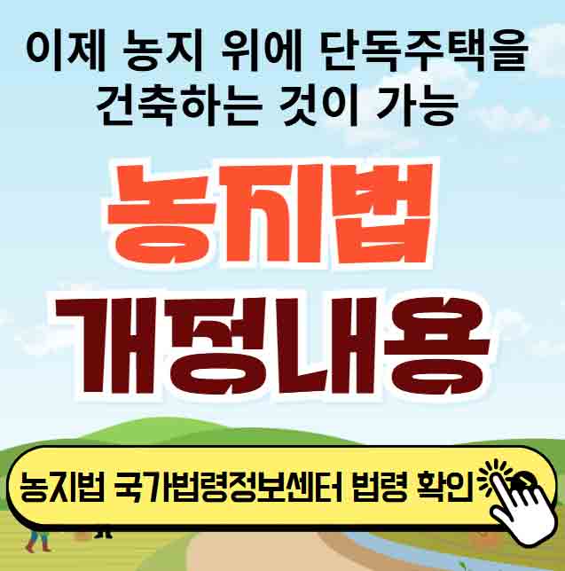 오늘은 많은 분들이 궁금해하시는 2024년 농지법 개정에 대해 알아보겠습니다. 특히 농지 위에 단독주택을 건축하는 것이 가능해진 점을 중심으로, 개정된 주요 내용을 정리해 드릴 테니 끝까지 읽어 주세요. 개정된 농지법이 구체적으로 알고싶으시다면 아래에 농지법 국가법령정보센터 법령확인을 통해서 확인하시면 좀더 자세한 법령을 확인하실수 있습니다.
