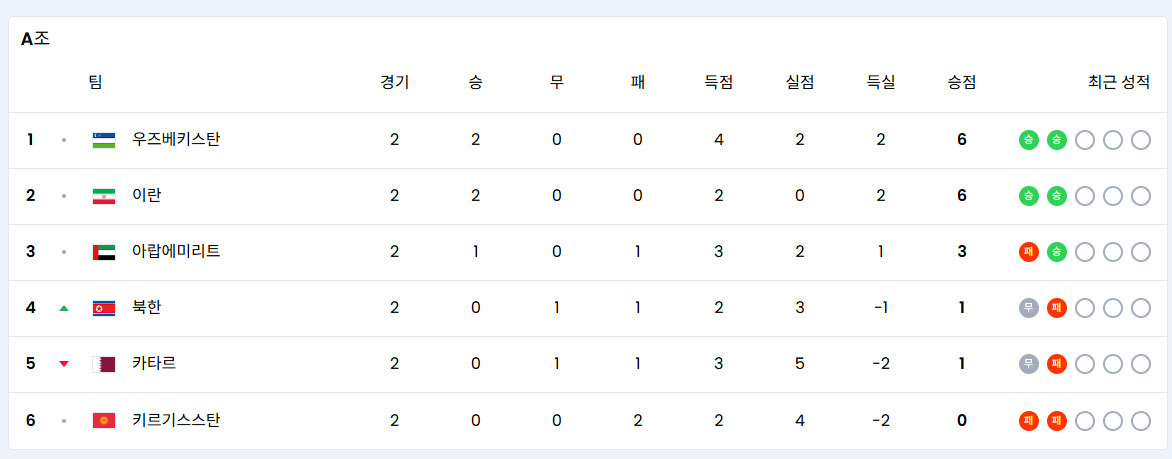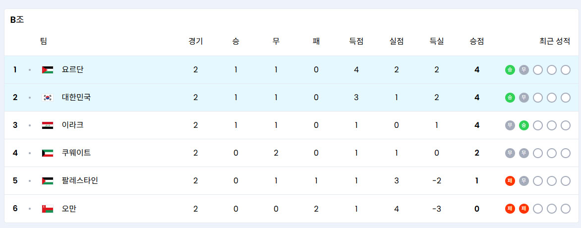 B조의 1위와 2위 팀이 2026 북중미 월드컵에 직행할 수 있습니다. 현재까지 팔레스타인과 오만과 경기를 치렀는데, 팔레스타인과의 홈 경기에서 무승부를 기록한 것은 아쉬움이 남습니다.