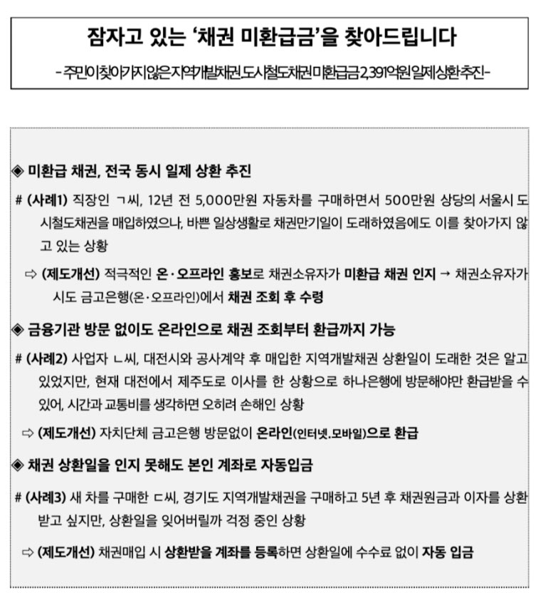 보도자료에는 다음과 같이 온라인 상환 은행 목록이 나와 있었지만, 저도 확인해 보려고 해보니까 농협은 아직 앱에서는 안 pc에서는 로그인하고 공과금 메뉴에서 지역 개발 채권 미상환 채권 조회, 상한에서 아이디나 주민등록번호로 조회해 보실 수 있습니다. 다른 은행도 비슷한 방법으로 주민등록번호로 미환급 채권 조회해보시고 신청할 환급금 선택하고 환급 정보 확인 후 원하시는 계좌로 입금 신청하시면 됩니다. 자동차 등록 외에도 지자체로부터 각종 인허가를 받는 경우나 자치단체와 공사, 용역, 물품 계약을 체결할 경우에도 의무적으로 채권을 매입해야 하기 때문에 찾아가지 않은 391억 원 중 내가 찾아가지 않은 채권이 있는지 혹시 매년 20억 원씩 사라지는 채권 권리에 내 채권도 있는지 한 번씩 확인해 보시면 좋겠습니다. 끝까지 시청해 주셔서 감사합니다. 영상이 유익했다면 주변 분들에게 공유해 주시고 다음 영상에서 우리 또 만나요.