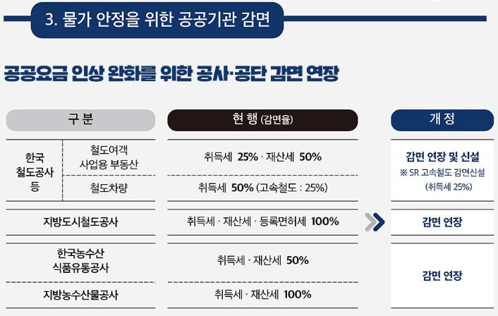공공요금 인상완화를 위한 공사와 공단 감면 연장과 SR 고속철도 취득세 25% 감면이 신설되었습니다.